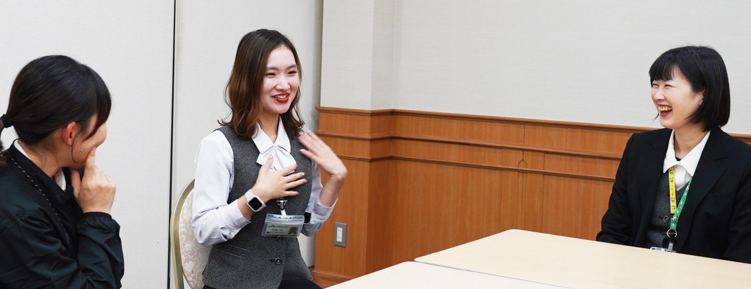 Wさん 朝礼がある支店では、自由テーマで1分スピーチをすることもあって、普段の仕事以外の一面を知れるのもいいなと思います。自然とコミュニケーションが生まれますね。